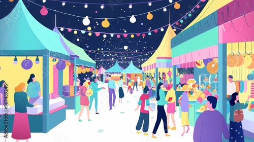 A cute cartoon Style ofA dynamic night market with colorful stalls, street food, and busy shoppers