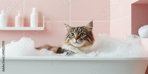 A cute cat relaxes in a bathtub filled with soap bubbles exuding happiness. Shampoo bottles are placed nearby all set against a light pastel backdrop ideal for pet care themes