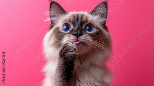 A cute cat with striking blue eyes and a playful expression against a pink background.