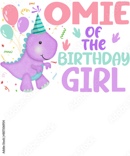A cute dinosaur with a party hat and balloons says "Some of the Birthday Girl". Perfect for birthday cards and party invitations.