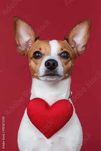A cute dog with a heart-shaped toy poses against a red background, radiating love and affection.