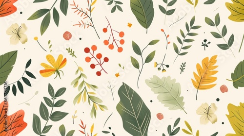 A cute, flat-style illustration with a pattern of leaves, flowers, and berries in muted natural colors, background, wallpaper