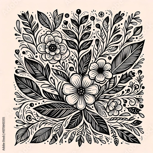 A cute floral pattern with cream, blue, yellow and purple flowers and dark stems and leaves on a white background.