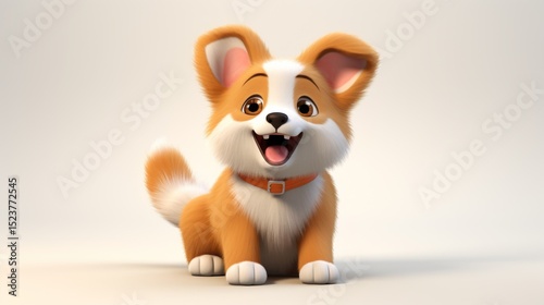 A cute, fluffy, orange corgi puppy with dot eyes. It's smiling, tongue out, sitting playfully. A simple, adorable 3D pet on a white background.