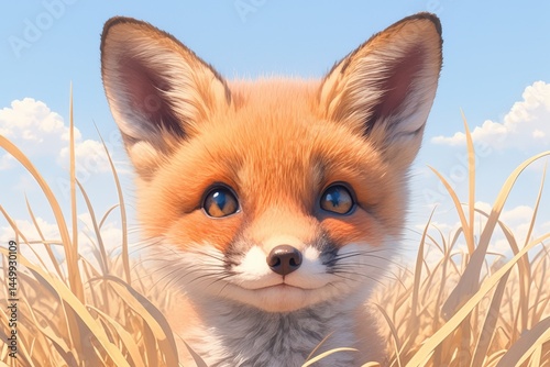 A cute fox peers out from tall grass, sunny blue sky as a backdrop
