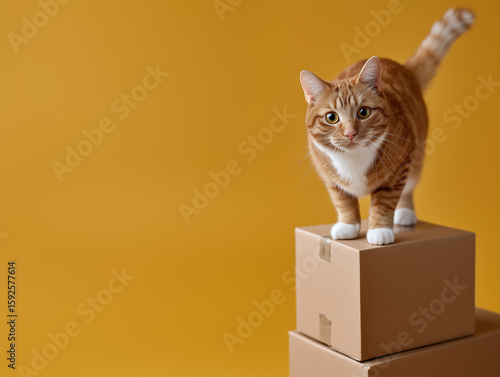 A cute ginger cat standing on stacked cardboard boxes with a yellow background. The cat looks playful and curious