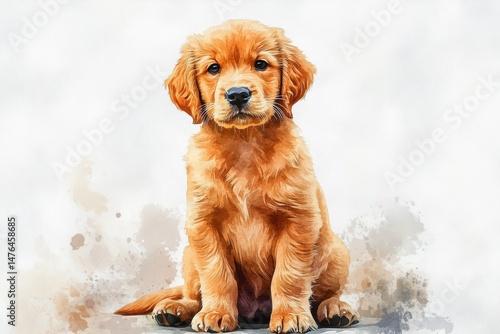 A cute golden retriever puppy sits against a white background, looking directly at the viewer with an adorable expression.