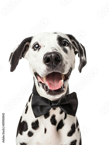 A cute Great Dane dog wearing a black bowtie.