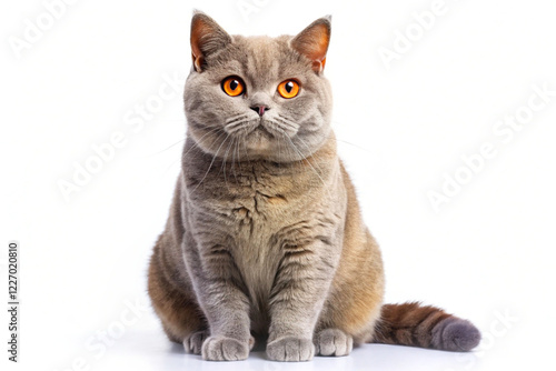 A cute grey British shorthair cat with orange eyes is sitting on a white background. The cat is looking up and to the right with a curious expression. Its fur is soft and fluffy
