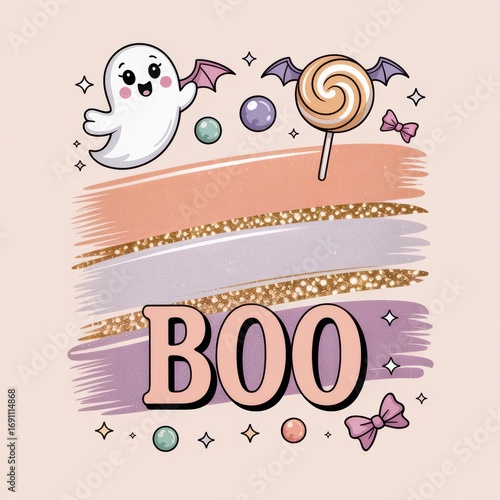 A cute, Halloween-themed illustration featuring a friendly ghost, a lollipop, and playful elements like bats and colorful candies, accented with the word "BOO.