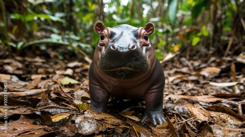 A cute hippo standing amidst dense foliage in its natural habitat.