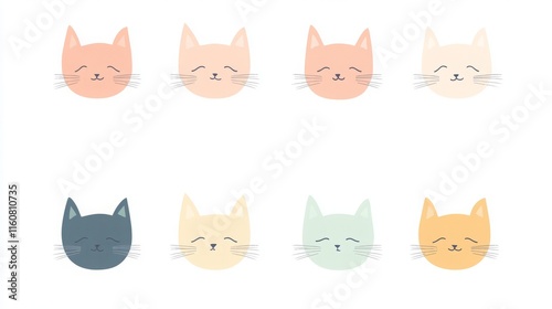 A cute illustration featuring various cat faces in pastel colors arranged in two rows.