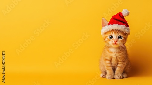 A cute kitten wearing a festive Christmas hat, sitting against a cheerful yellow background, wishing a Happy New Year and Merry Christmas