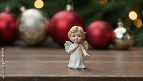 A cute little Christmas Angel is perched upon a wooden table with festive backdrop of blurred Christmas decorations