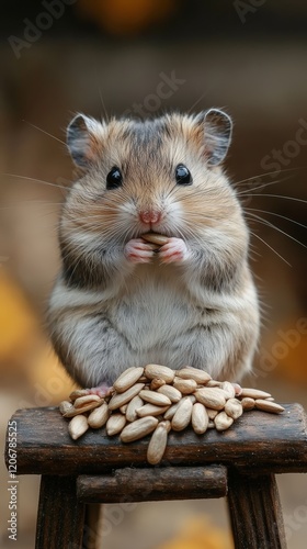 A cute little hamster sitting on top of a wooden chair, eating sunflower seeds.