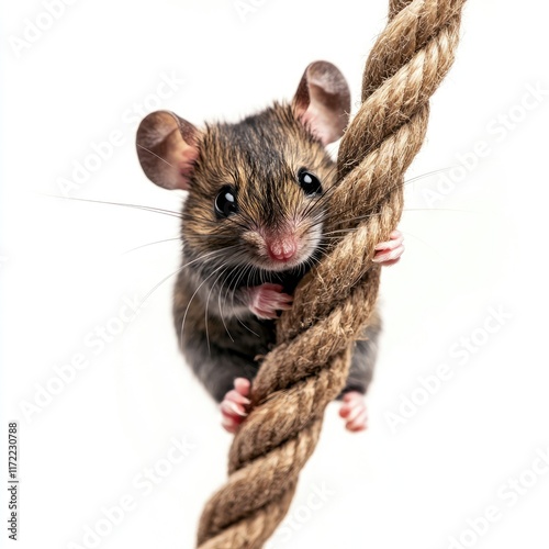 A cute mouse clings to a rope, showcasing its playful nature and curiosity.