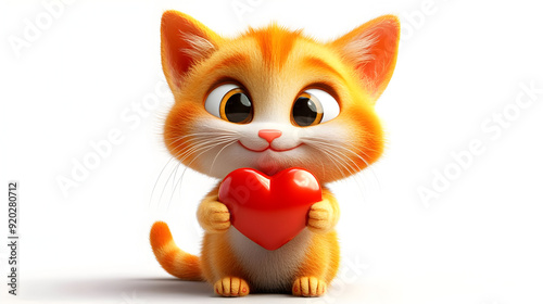 A cute orange kitten holding a red heart, symbolizing love and affection.