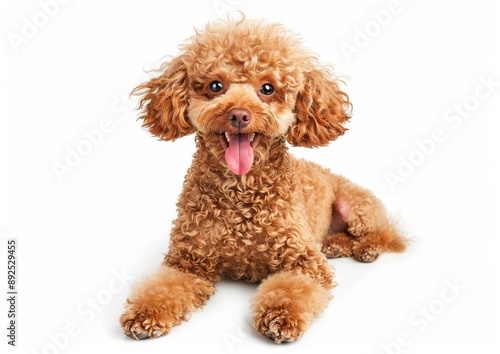 A cute Poodle dog sticks out his tongue and smiles on a white background.