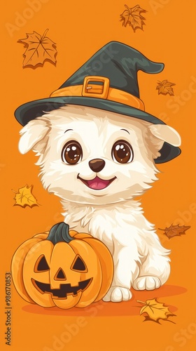 A cute puppy wearing a witch hat sits next to a carved pumpkin against an orange background, celebrating the Halloween spirit.
