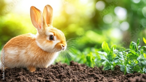 A cute rabbit sitting on soil amidst greenery in a sunlit garden.