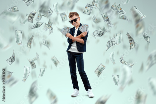 A cute, rich boy with glasses holds dollars and knows how to make money against the background of falling banknotes. Money rain, Financial education, young millionaire, investments, loans, winnings