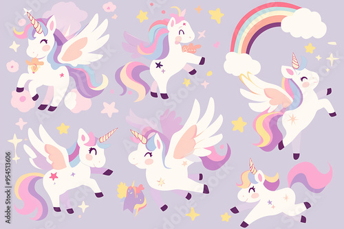 A cute set of unicorn stickers featuring unicorns in various poses and expressions