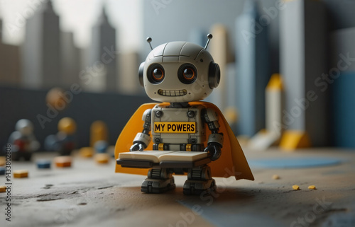 A cute, small robot in a cape holds a book, standing in a miniature cityscape. It represents knowledge and technological advancement.