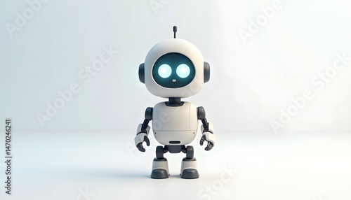 A cute small robot with round eyes and a friendly expression, standing on a clean white background