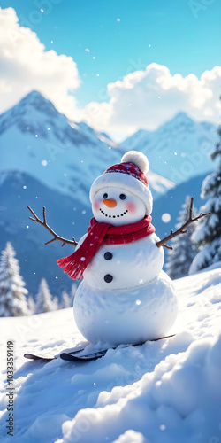 A cute smiling snowman is skiing in the snow-covered mountains in winter, with beautiful clouds in the blue sky. Christmas atmosphere.