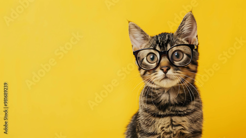 A cute tabby cat wearing glasses and looking at the camera.