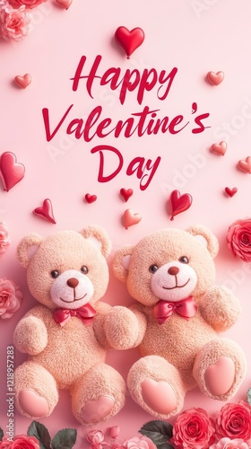 A cute Valentine's Day wallpaper. teddy bears. roses. hearts on a pink background.
