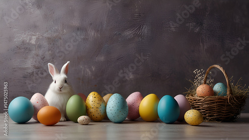 A cute white Easter bunny figurine sits nestled in a rustic bird's nest alongside decorated eggs and fresh green leaves against a dramatic dark holiday background