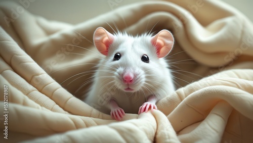 A cute white rat with pink nose and ears nestled in a soft beige blanket looking at the camera