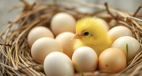 A cute yellow chick among fresh eggs in a cozy nest, representing new beginnings and spring joy.