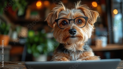 A cute Yorkshire Terrier dog wearing glasses and looking at the camera while sitting on a wooden table with a laptop in front of him.