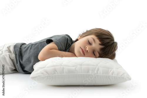 a cute young boy child sleeps on a white pillow, isolated on white background. ai generative