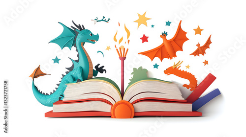 A cut-out of a school storytelling session with books, dragons, and magic wand icons on a white background, illustration of a book