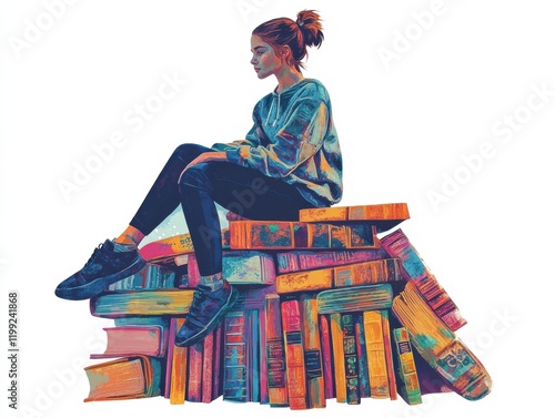 A cut-out style depiction of a young girl sitting on a large stack of books, her hair in a ponytail, wearing casual clothing. The books have intricate