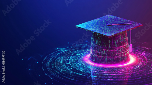 A cyber graduation cap icon glowing with achievement metrics, symbolizing online certification platforms, virtual degree programs, and educational success analytics.