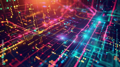 A cybernetic interface background with complex digital data arrays and vibrant neon lines intersecting against a dark, high-tech backdrop.