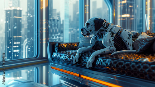 A cybernetically enhanced pet, part organic and part mechanical, lounging on a sleek, futuristic sofa in a high-tech apartment overlooking the city skyline.