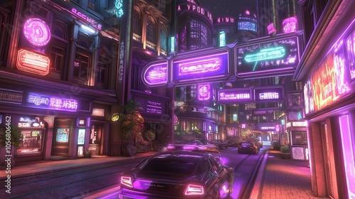 A cyberpunk-inspired street with holographic signs, neon lights, and futuristic buildings