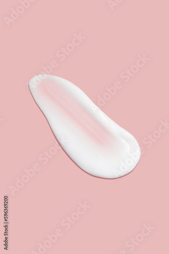 A dab of cosmetic cream. Light, smooth surface. Texture of spreadable cream. Liquid cream smear. On a pink background.
