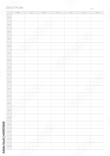 A daily plan design template in a modern, simple, and minimalist style. Note, scheduler, diary, calendar, planner document template illustration.