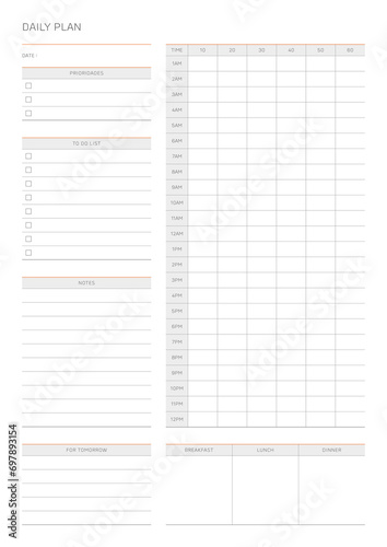 A daily plan design template in a modern, simple, and minimalist style. Note, scheduler, diary, calendar, planner document template illustration.