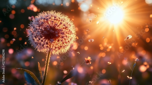A dandelion seed head illuminated by the sun with rays of light shining through it and small insects flying around