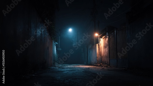 A dark alleyway illuminated by a single flickering light, the silence of the night deep and unsettling alleyway, dark road, night silence