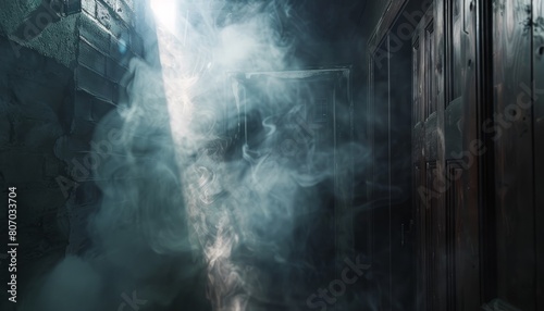 A dark and eerie smoke-filled scene, creating a spooky and mysterious atmosphere, perfect for horror-themed backgrounds or Halloween events