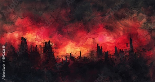 a dark and moody abstract watercolor matte painting of a twighlit sky of deep reds and oranges. In the foreground the silhouette of a civilization constructed from discarded rubbish