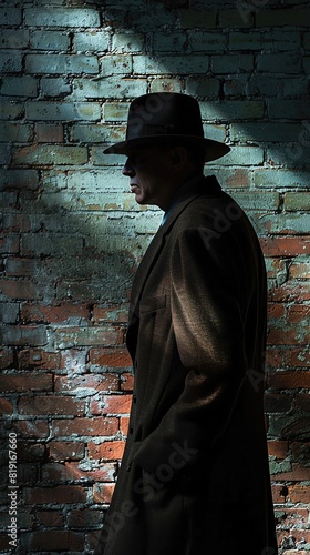 A dark and mysterious man wearing a hat and coat stands alone in an alleyway